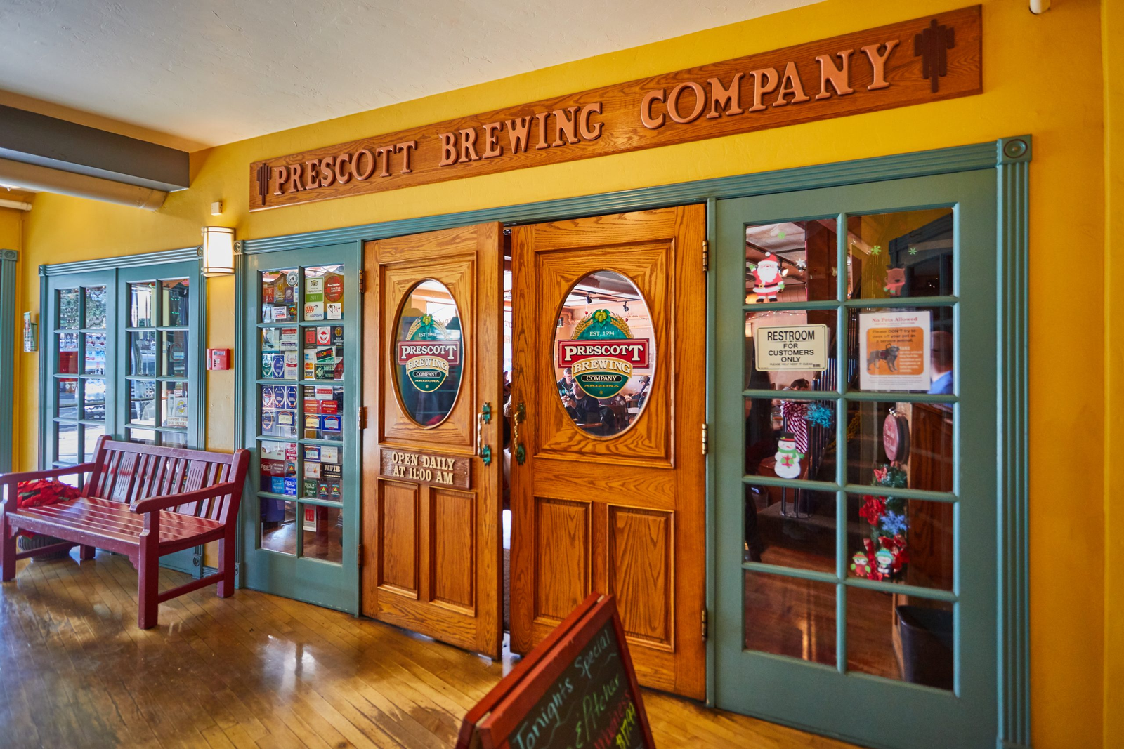 Atmosphere: With its brick walls, soaring ceilings and giant movie theater marquee, Prescott Brewing has heaps of character. It gets lively at peak times but there’s usually no wait for a table.
