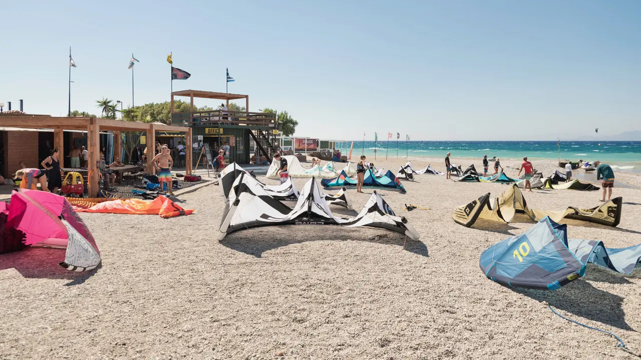 Visitors can arrange kitesurfing lessons and rentals through the Meltemi Center. Or simply spread out on the sandy stretch and watch in awe as the colorful kites soar and flip above the sparkling Mediterranean.